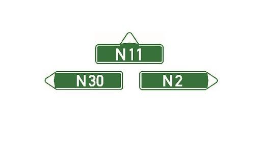 Zelené značky s bílým písmem. Informují o směru a čísle náhradní trasy.