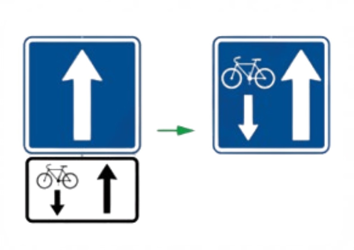 Pozor na novou variantu této značky, kde je ve spodní části symbol kola a dvě šipky. Znamená to, že auta jedou jen jedním směrem, ale cyklisté mohou jezdit legálně v obou směrech (i v protisměru k vám).